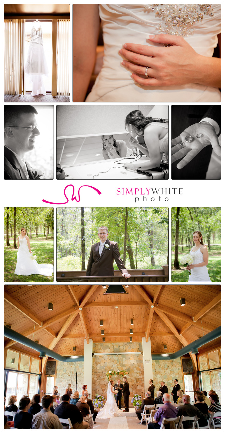 Their midday ceremony and reception at Post Oak Lodge really highlighted the versatility of the location. The lodge, set high in the Osage hills just north of downtown, is nestled amid a peaceful forest of oak. With the heat of summer already at full press in June, the two opted to keep everything indoors. The Aspen Room, serving as a small chapel, was filled with light from windows on two sides. The reception was set in the more spacious Evergreen Room, with its view of the sun-lit woods. Danielle was a super-organized bride and kept everyone on time. She was constantly smiling, too, even as she hurried to don her gown with its side-swept skirt and intricately beaded bodice.