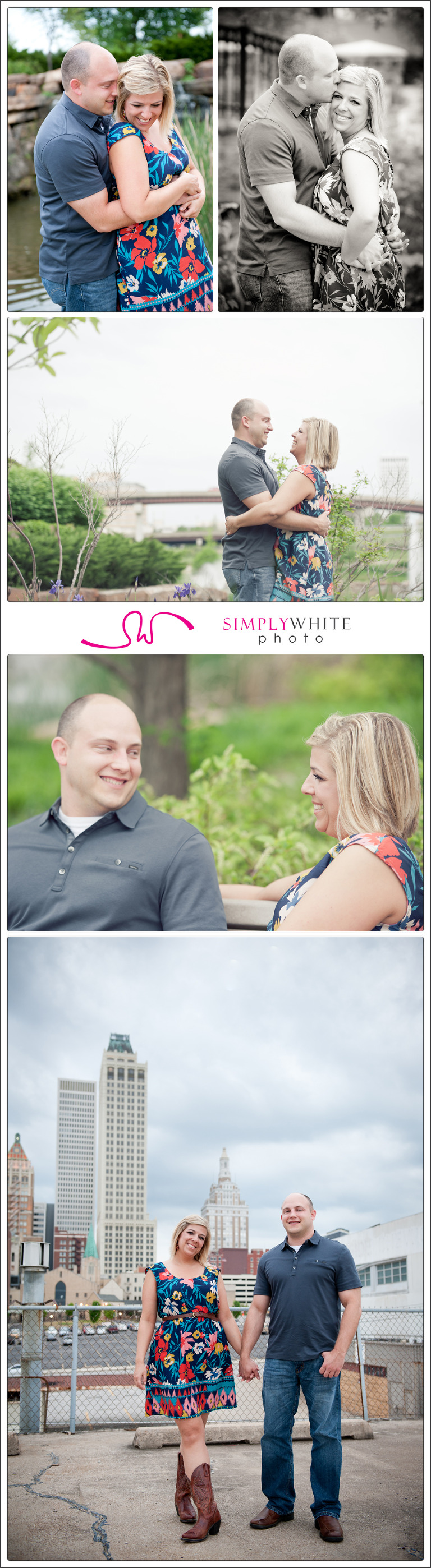 Lindsay and Aaron told me that they live in the country, or almost, but are sort of city people so they weren’t sure if they wanted urban or earthy photos, so we headed downtown and did a little of both. All day the sun had come in and out of the clouds, but storms were rolling in and right before our session began the clouds took over the sky. Although we were hoping that the sun would peek through just a little here and there, it ended up being perfect weather for our outdoor shoot at Centennial Park and then in the heart of downtown Tulsa.