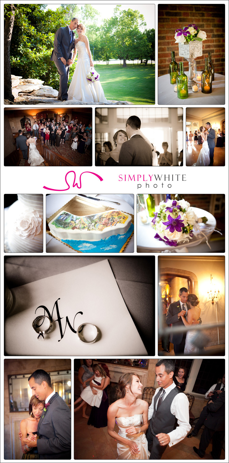 Whitney and Michael wrote their own vows, and exchanged them in a moving ceremony on the back terrace overlooking the Arkansas River. They had wanted to keep the details simple, knowing Harwelden’s own beauty would speak for itself. Tables were set inside with flower arrangements created by Michael’s aunt, Diana Montane, and wine bottles that topped small candles. Just Catering by Orr created a splendid and tasty buffet and Merritt’s Bakery designed the luscious cake. The groom’s cake was an awesome reproduction of a mid-century map of California, almost  something you would want to frame instead of eat.